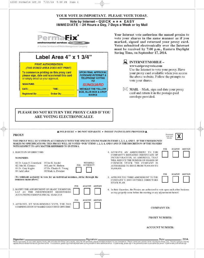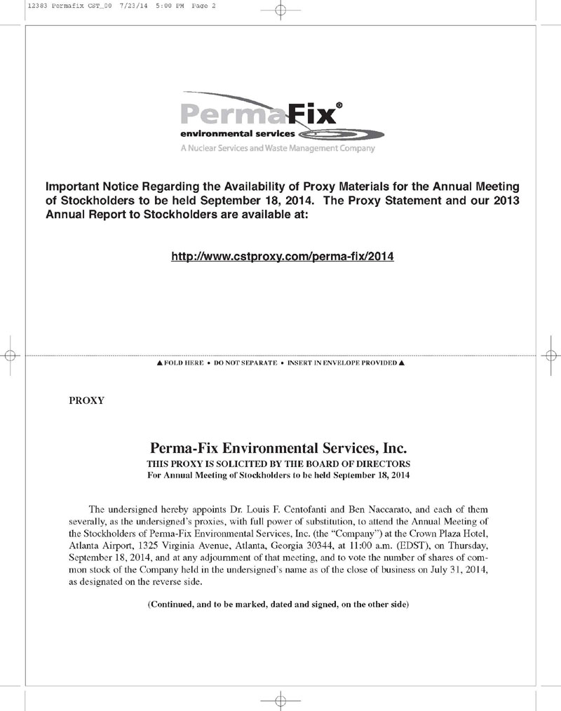 You are receiving this Proxy Statement from us because you were a stockholder of record of the common stock, par value $.001 (the “Common Stock”), of Perma-Fix Environmental Services, Inc. (the “Company”, “we”, “our”, or “us”) at the close of business on July 31, 2014 (the “Record Date”). This Proxy Statement is furnished in connection with the solicitation on behalf of the Board of Directors of the Company (the “Board of Directors” or the “Board”) of proxies to be used in voting at the 2014 Annual Meeting of Stockholders to be held at the Crowne Plaza Hotel, Atlanta Airport, 1325 Virginia Avenue, Atlanta, Georgia, 30344, on Thursday, September 18, 2014, at 11:00 a.m. (EDST), and any adjournments thereof (the “Meeting”). By use of a proxy, you may vote whether or not you plan to attend the Meeting. This Proxy Statement describes the matters on which the Board would like you to vote, and provides information on those matters, so that you can make an informed decision.