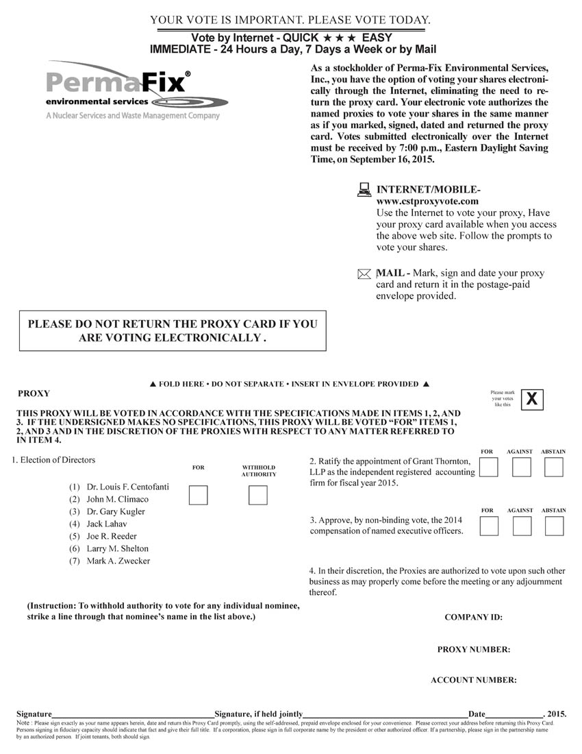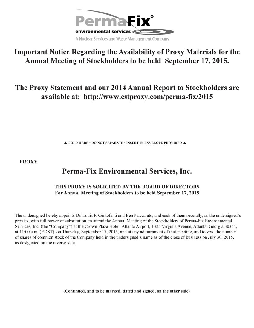You are receiving this Proxy Statement from us because you were a stockholder of record of the common stock, par value $.001 (the “Common Stock”), of Perma-Fix Environmental Services, Inc. (“Perma-Fix”, the “Company”, “we”, “our”, or “us”) at the close of business on July 30, 2015 (the “Record Date”). This Proxy Statement is furnished in connection with the solicitation on behalf of the Board of Directors of the Company (the “Board of Directors” or the “Board”) of proxies to be used in voting at the 2015 Annual Meeting of Stockholders to be held at the Crowne Plaza Hotel, Atlanta Airport, 1325 Virginia Avenue, Atlanta, Georgia, 30344, on Thursday, September 17, 2015, at 11:00 a.m. (EDST), and any adjournments thereof (the “Meeting”). By use of a proxy, you may vote whether or not you plan to attend the Meeting. This Proxy Statement describes the matters on which the Board would like you to vote, and provides information on those matters, so that you can make an informed decision.