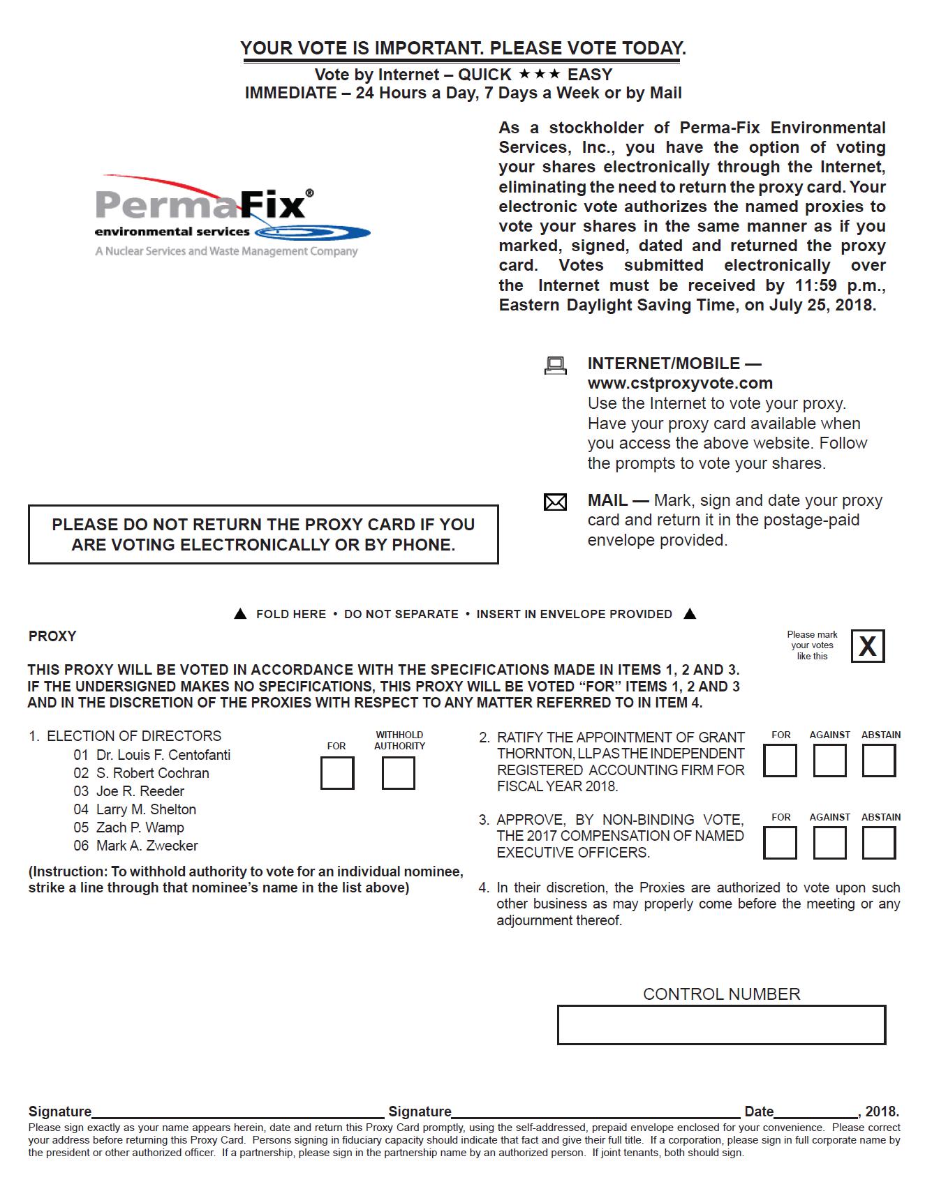 You are receiving this Proxy Statement from us because you were a stockholder of record of the common stock, par value $.001 (the “Common Stock”), of Perma-Fix Environmental Services, Inc. (“Perma-Fix”, the “Company”, “we”, “our”, or “us”) at the close of business on June 7, 2018 (the “Record Date”). This Proxy Statement is furnished in connection with the solicitation on behalf of the Board of Directors of the Company (the “Board of Directors” or the “Board”) of proxies to be used in voting at the 2018 Annual Meeting of Stockholders to be held at the Crowne Plaza Hotel, Atlanta Airport, 1325 Virginia Avenue, Atlanta, Georgia, 30344, on Thursday, July 26, 2018, at 11:00 a.m. (EDST), and any adjournments thereof (the “Meeting”). By use of a proxy, you may vote whether or not you plan to attend the Meeting. This Proxy Statement describes the matters on which the Board would like you to vote, and provides information on those matters, so that you can make an informed decision.