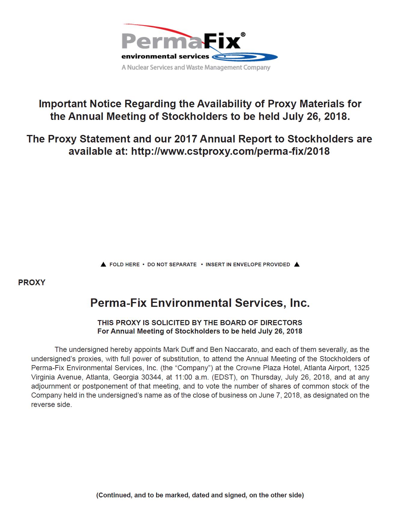 Notice is hereby given that the 2018 Annual Meeting of Stockholders (the “Meeting”) of Perma-Fix Environmental Services, Inc. (the “Company”) will be held at the Crowne Plaza Hotel, Atlanta Airport, 1325 Virginia Avenue, Atlanta, Georgia 30344, on Thursday, July 26, 2018, at 11:00 a.m. (EDST), for the following purposes: