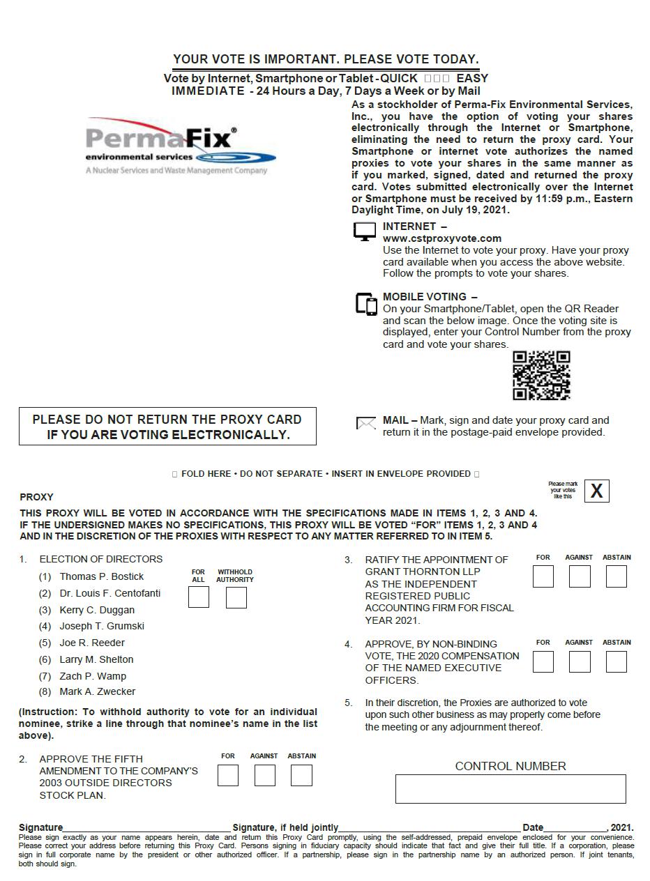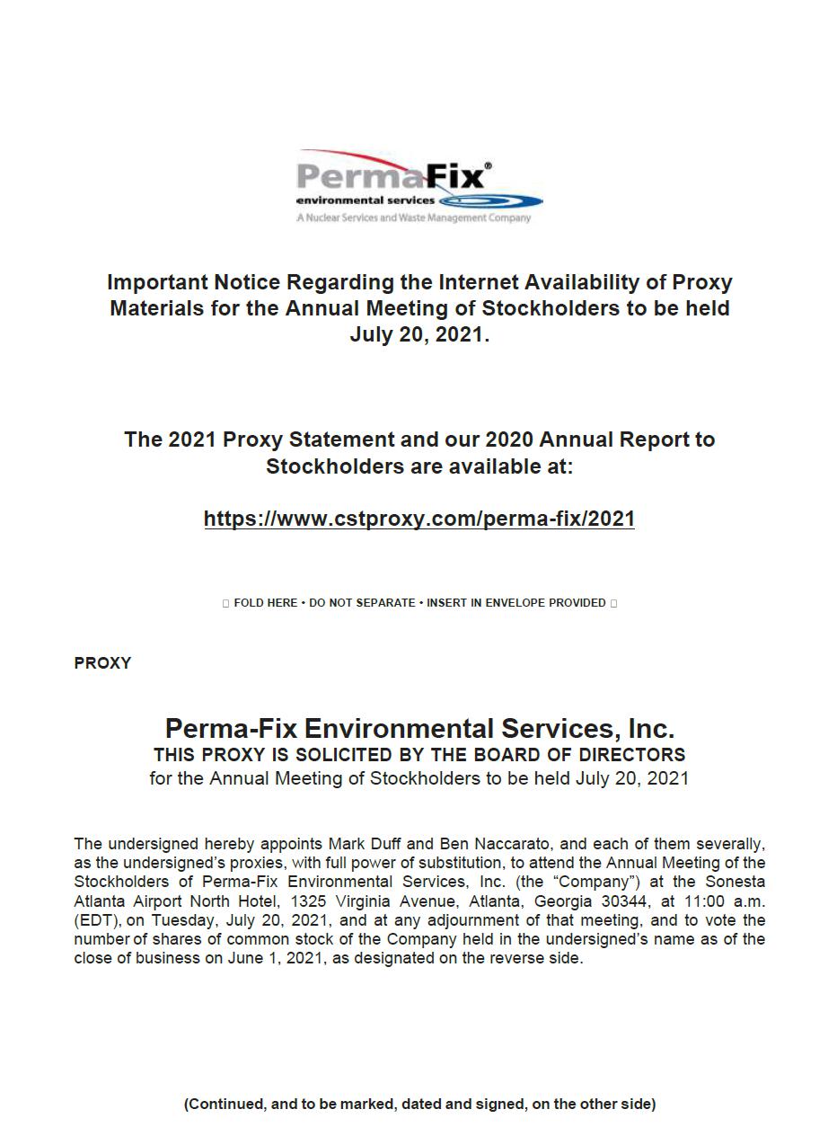 Important Notice Regarding the Internet Availability of Proxy Materials for the Annual Meeting of Stockholders to be Held on July 20, 2021: This Proxy Statement and our Annual Report for 2020 are available at: https://www.cstproxy.com/perma-fix/2021