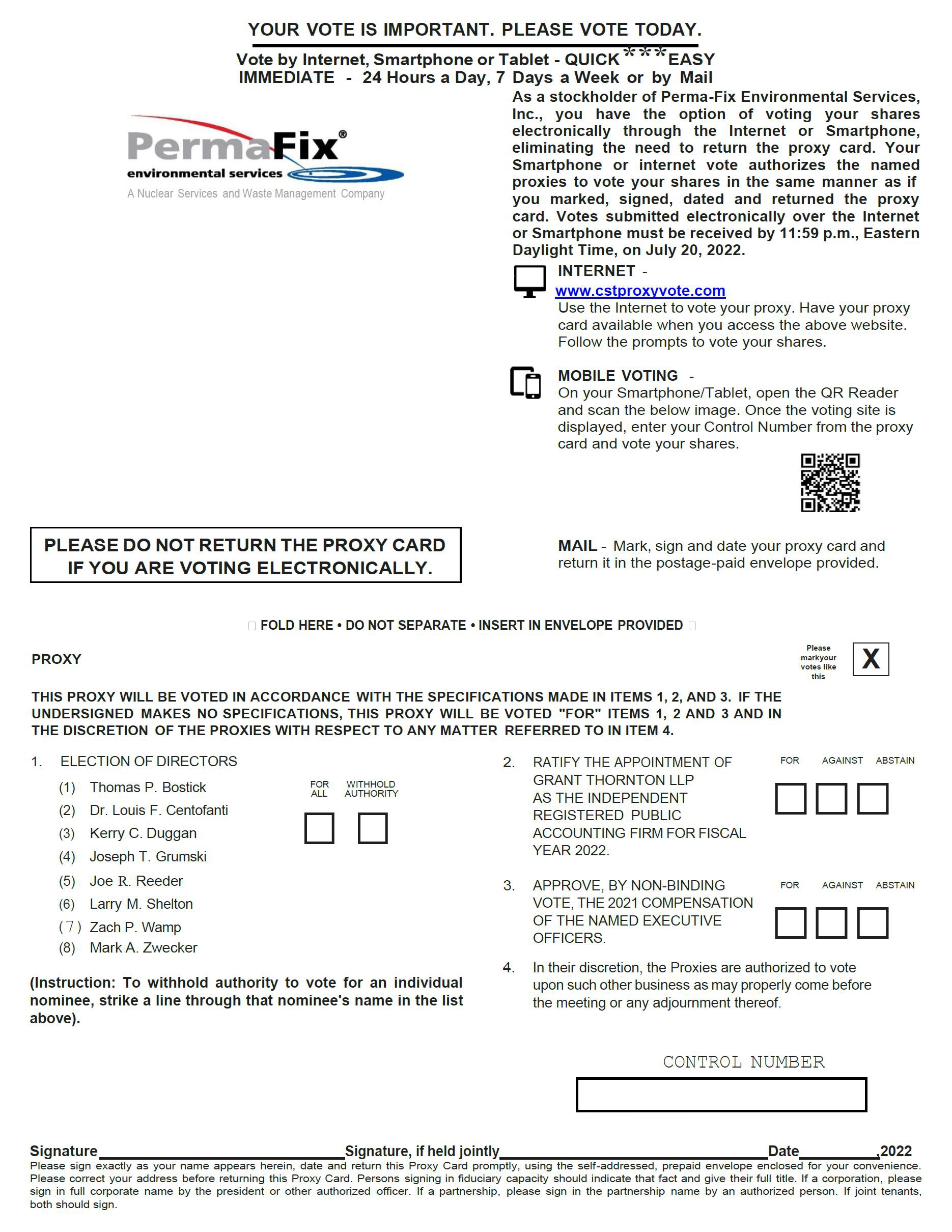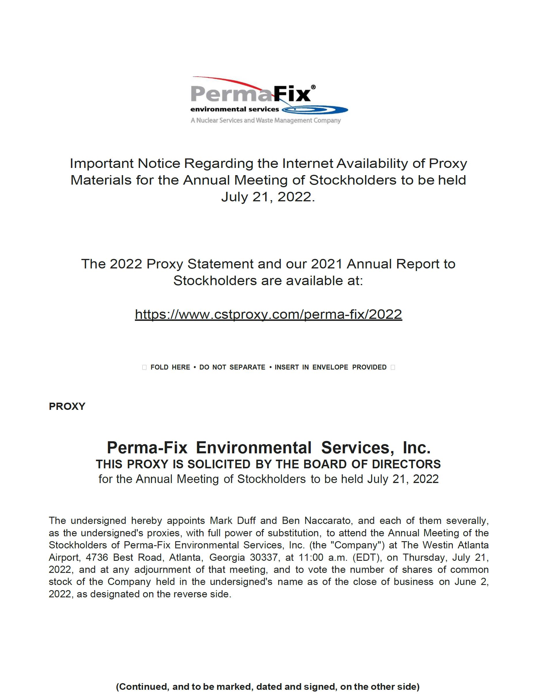 Important Notice Regarding the Internet Availability of Proxy Materials for the Annual Meeting of Stockholders to be Held on July 21, 2022: This Proxy Statement and our Annual Report for 2021 are available at: https://www.cstproxy.com/perma-fix/2022.