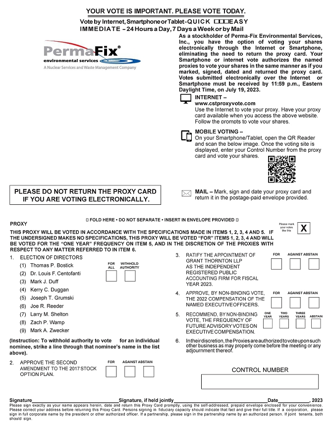 Important Notice Regarding the Internet Availability of Proxy Materials for the Annual Meeting of Stockholders to be Held on July 20, 2023: This Proxy Statement and our Annual Report for 2022 are available at: https://www.cstproxy.com/perma-fix/2023.