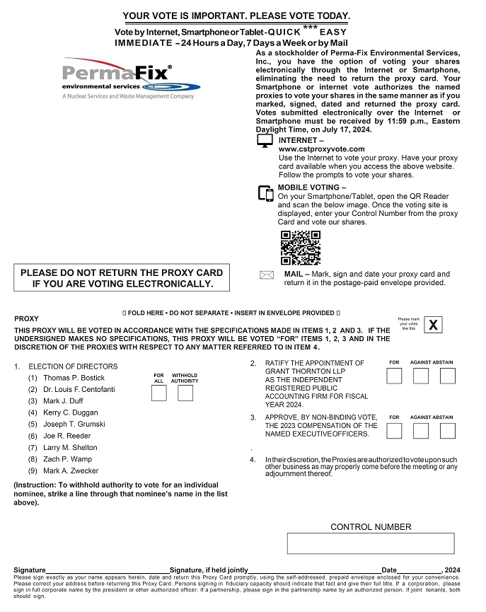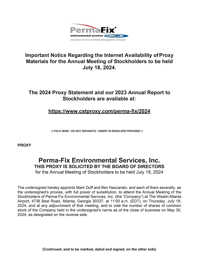 Important Notice Regarding the Internet Availability of Proxy Materials for the Annual Meeting of Stockholders to be Held on July 18, 2024: This Proxy Statement and our Annual Report for 2023 are available at: https://www.cstproxy.com/perma-fix/2024.
