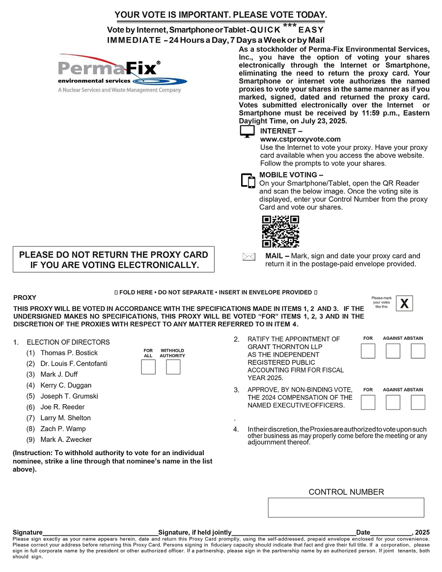 Important Notice Regarding the Internet Availability of Proxy Materials for the Annual Meeting of Stockholders to be Held on July 24, 2025: This Proxy Statement and our Annual Report for 2024 are available at: https://www.cstproxy.com/perma-fix/2025.