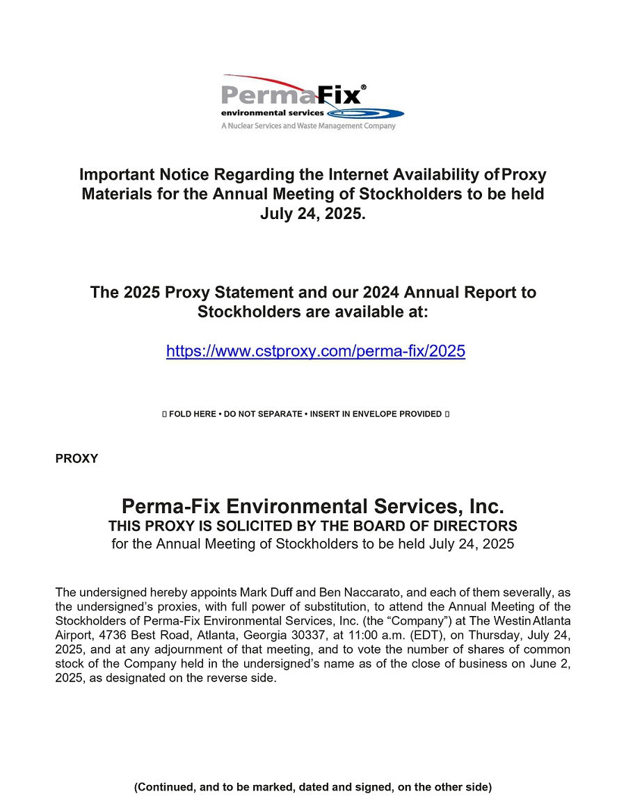 Notice is hereby given that the 2025 Annual Meeting of Stockholders (the “Meeting”) of Perma-Fix Environmental Services, Inc. (“Company”, “we”, “our”, or “us”) will be held at The Westin Atlanta Airport, 4736 Best Road, Atlanta, Georgia 30337, on Thursday, July 24, 2025, at 11:00 a.m. (EDT), for the following purposes: